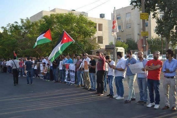 بدعوة من القوى الشبابية والوطنية الاردنية اقيم مساء الاربعاء أمام مقر الصليب الاحمر الدولي في عمان اعتصاماً تضامنياً مع الاسرى الفلسطينيين الذين يخوضون معركة الأمعاء الخاوية ودعماً للأسير البطل بلال كايد المضرب عن منذ أكثر من خمسين يوما، حيث رفع المشاركون شعارات تؤكد وقوف الشعب الاردني مع الاسرى الفلسطينيين في اضرابهم كما رفعوا صور للأسير الكايد وللقائد احمد سعدات