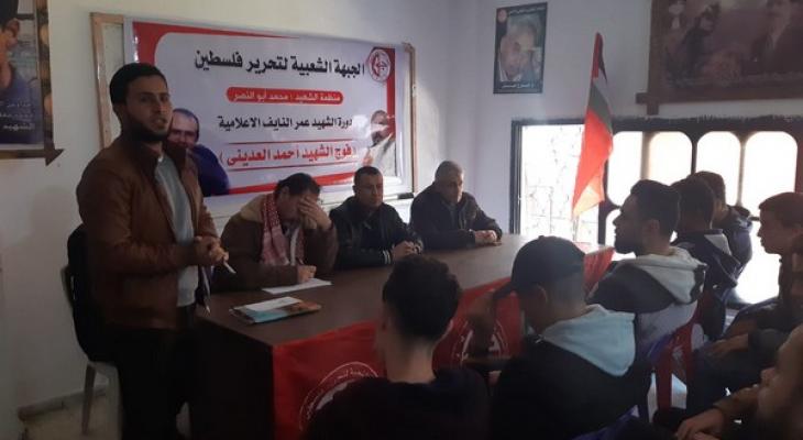افتتحت الجبهة الشعبية في محافظة الوسطى منطقة النصيرات برنامج الدورات الإعلامية التي سيتم عقدها على عدة أيام متتالية بعنوان "دورة الشهيد عمر النايف- فوج الشهيد أحمد العديني" وذلك على شرف ذكرى الحكيم جورج حبش والشهداء القادة اليماني ومحمد أبو النصر، بمشاركة مسئول المنطقة وأعضاء قيادتها.