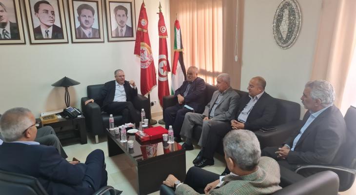 وحيى الوفد الشعب التونسي والاتحاد العام التونسي للشغل وعماله ونقاباته لدعمه المتواصل للقضية الفلسطينية وللشعب الفلسطيني، مؤكدًا تواصل الصمود والاستبسال دفاعًا عن الأرض.