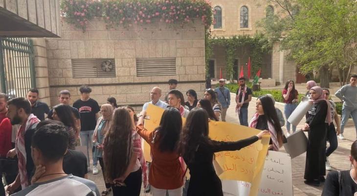أعلن مجلس الطلبة في جامعة بيت لحم بالضفة المحتلة، مساء اليوم الخميس 28 أبريل/ نيسان، أنّه علّق كافة أنشطته الاحتجاجيّة، وذلك بعد أن حقّق انتصارًا على إدارة الجامعة التي تعسّفت في قراراتها بحق الطلبة وممثّل جبهة العمل في الجامعة الرفيق فادي عيّاد على وجه التحديد، إذ جرى الاتفاق على إلغاء القرارات المتعلّقة بتحميد المجلس والانذارات الصادرة عن الإدارة.